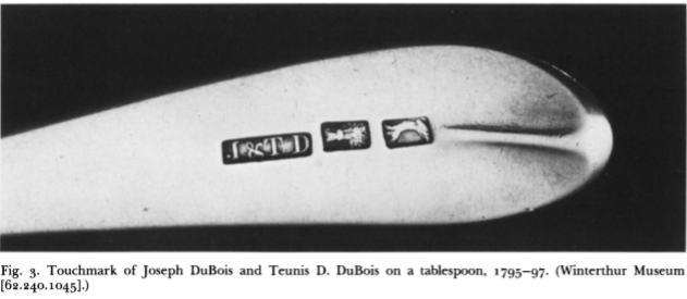 Laidlaw, Christine Wallace. “Silver by the Dozen: The Wholesale Business of Teunis D.DuBois.” Winterthur Portfolio, vol. 23, no. 1, 1988, pp. 25–50. JSTOR, http://www.jstor.org/stable/1181161.