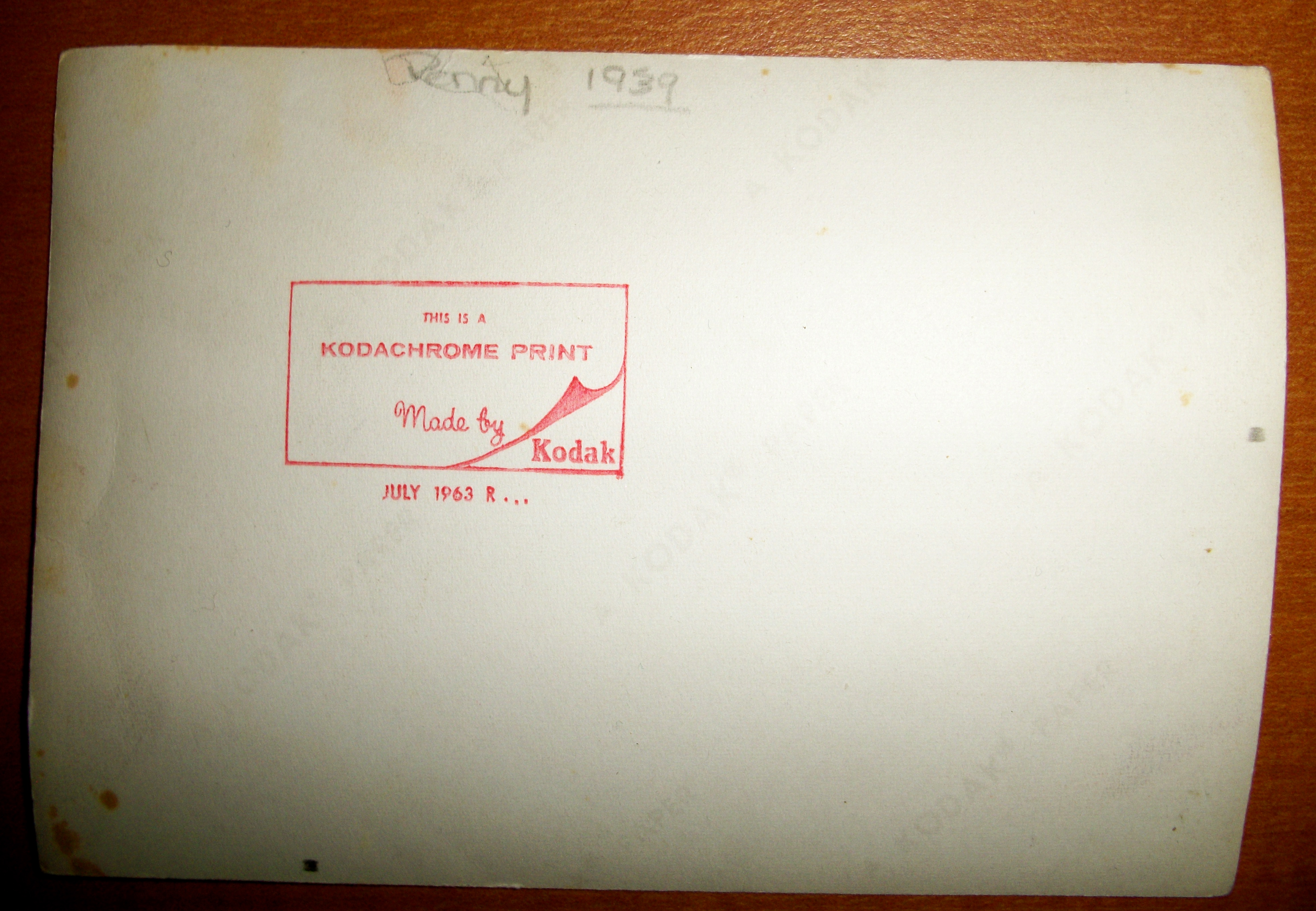 I began to develop my own theories about this photo, and scoured it for information . My Gramma had written “Penny 1939” lightly in pencil on the back. This was my first clue, the baby in the photo must be her. My Gramma was born in 1939, so this picture must have been taken before she was a year old. The back of the photo also reveals that this is a Kodak print, a “Kodachrome Print” to be specific. The Kodak company was founded in 1889 in Rochester New York, where my Gramma has lived her entire life. And a Kodachrome is a color reversal film that was introduced by the company in 1935, becoming one of the first successful color materials used for both cinematography and still photography. Its amazing to me that this technology was fairly recent at the time the photo was taken. Ironically Kodachrome was prohibited in the United States in 1954, the same year my Gramma got married. This photo holds some of Kodak’s history inside it I think. It represents how much has changed; not only the technology but also the status of the company. When this photo was taken, the Kodak company were innovators, the front runners of the industry, and now they are struggling to keep up the changing times. Perhaps this parallels a fate that befalls many people as we grow older.