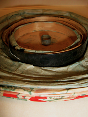 In its current flattened state, this lantern might not look like much. But in its prime its now faded paper and rusted wire frame would expand to become to beautiful traditional Maru paper lantern. The spherical skeleton is held between a thin circular wooden base and a wooden ring at the top, both painted black. There is a now mutilated wire handle attached to the top wooden ring and some splintering where the handle pierces the wood. A delicate teal paper covers the lanterns bones, erupting with a vibrant red floral pattern along its sides. But like they say, its the inside, not the out that counts. This philosophy rings true for the lantern. On the interior side of the base there is a metal holster for a candle, the light source that brings the lantern to life. There is still remnants of candle wax hardened to the wood, letting us know that this lantern served its purpose. Written neatly in pencil near the candle holder is “Lantern Nite 1934.” And beneath that in rougher scrawled text is the name E. Kniffen. The writing looks as if our lanterns owner signed the bottom when the lantern had already been opened. You can see them extending their hand down into the lantern, struggling to leave their mark, you can feel the presence.