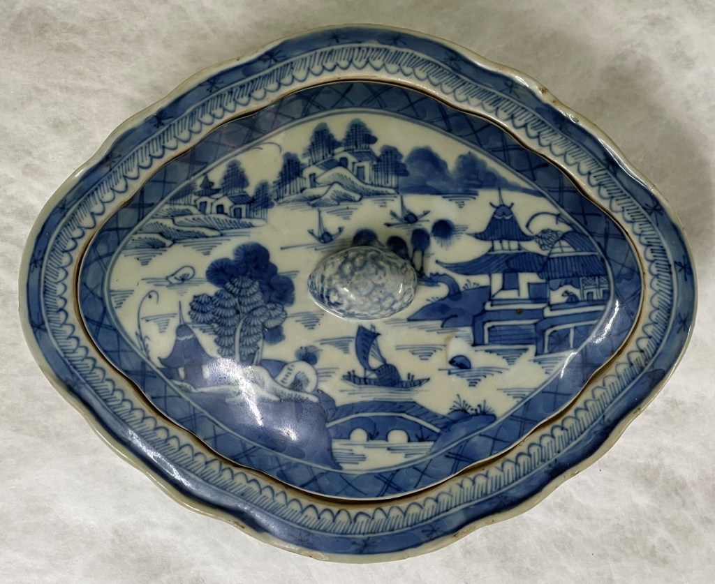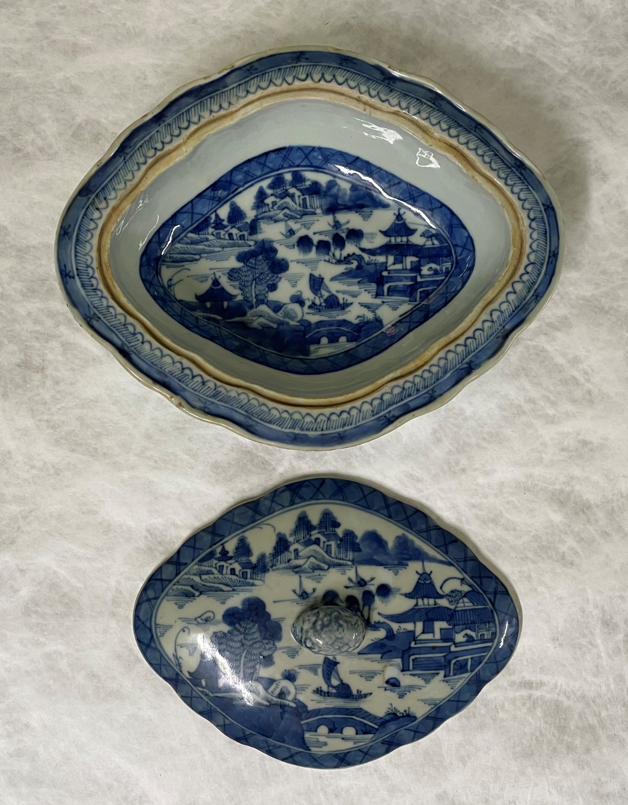 This diamond-shaped canton ware set includes a plate and a lid that come together as a vegetable serving dish. Both underglaze pieces are first adorned with painted scenes of a Chinese coastal village in a monochromatic cobalt blue before being covered in transparent ceramic glaze. The 3” deep dish is painted with the “blue willow” pattern. A serene atmosphere features trees growing in harmony alongside the riverbank. In the foreground, a junk ship with raised sails is floating between a small pedestrian bridge and a Siheyuan-style courtyard with pavilion roofs. Towering mountains uniformly line the background behind French country-style houses. An oval knob-like handle protrudes half an inch from the center of the lid, which obscures part of the painting. The 8” long by 6” wide cover is outlined with large decorative “X” markings on top of a thick blue band. Meanwhile, the lip of the deep dish is traced with a royal blue ribbon that fades into thin lines and scalloped edges. The dish is larger than the cover, measuring to be 9.5” by 7.5”.
