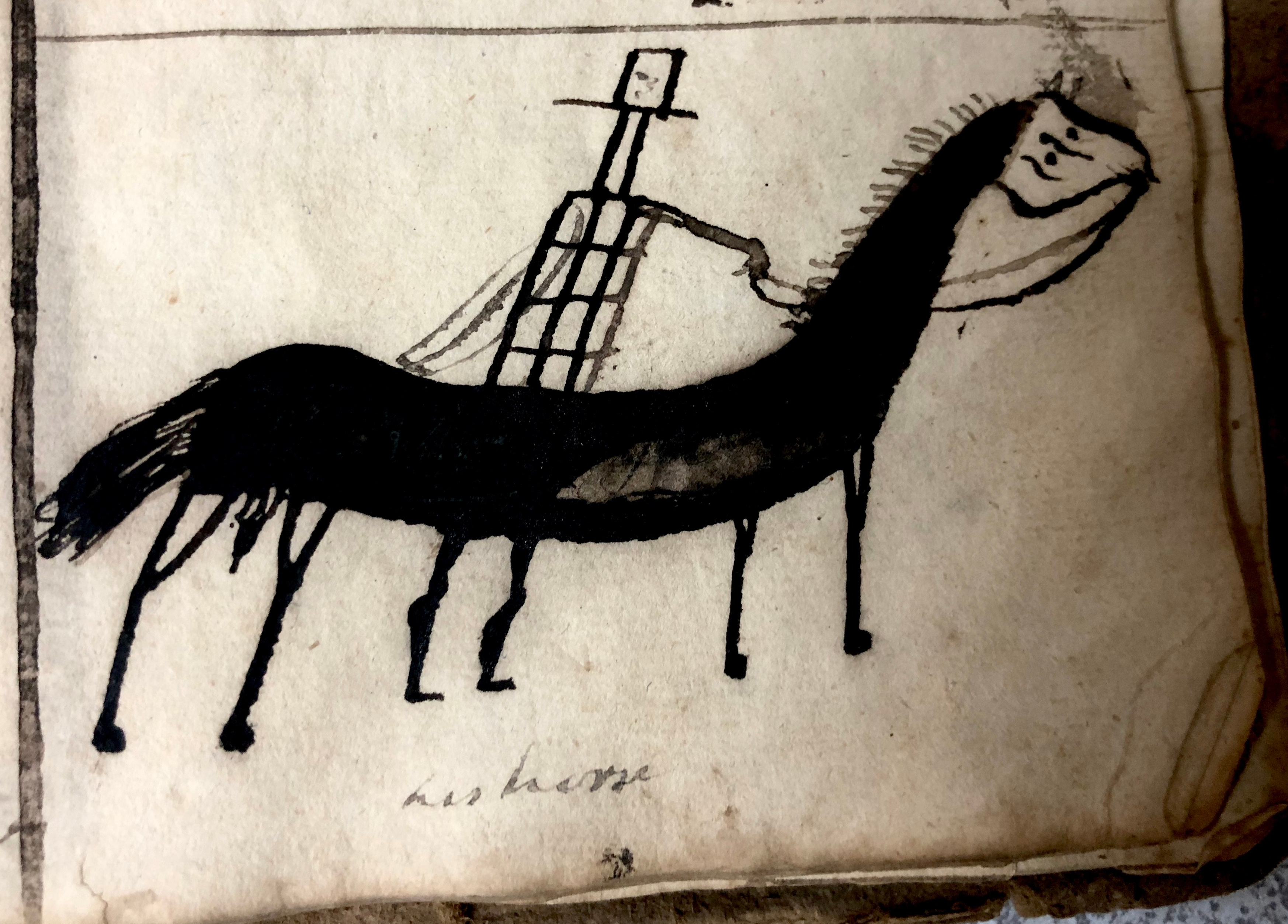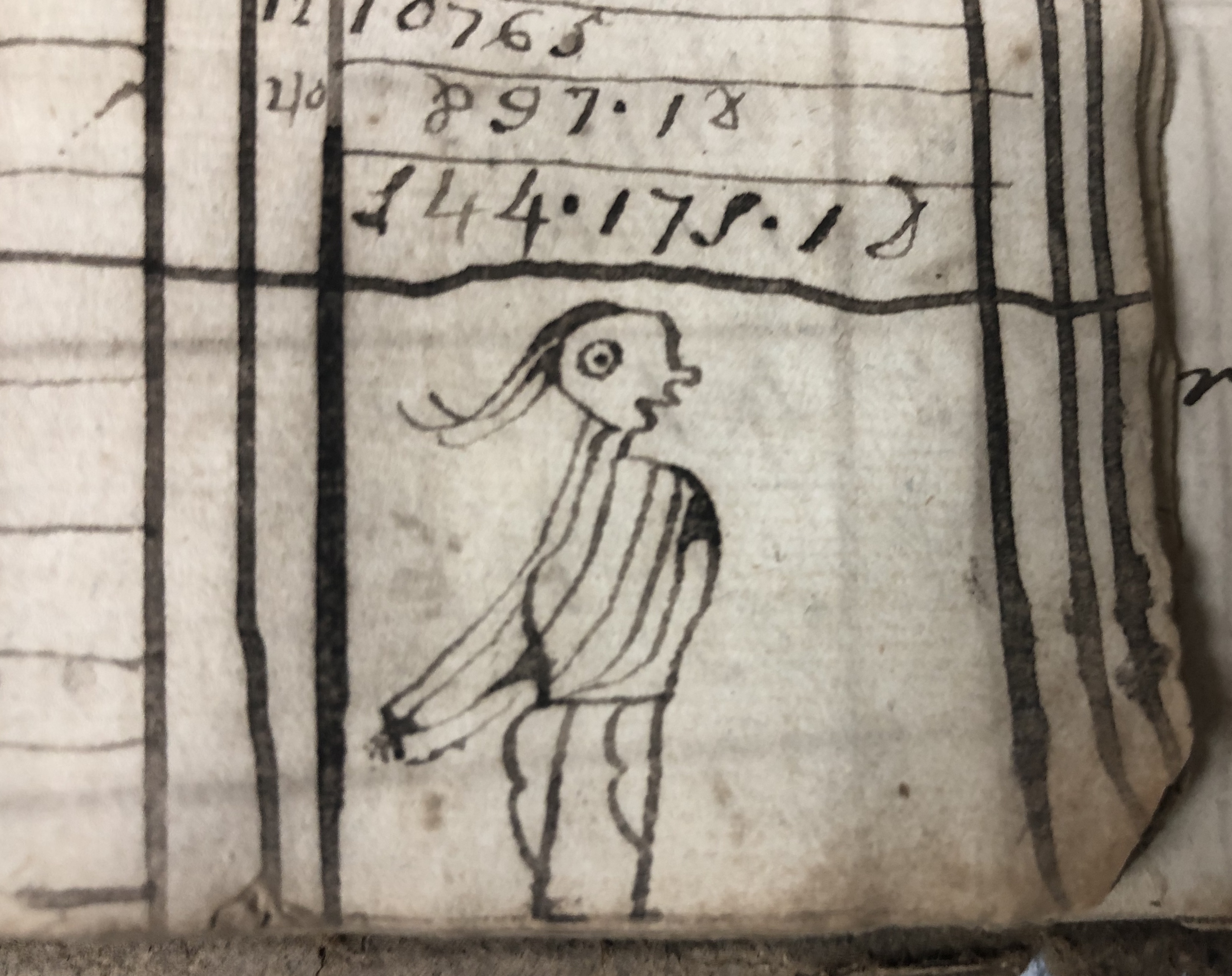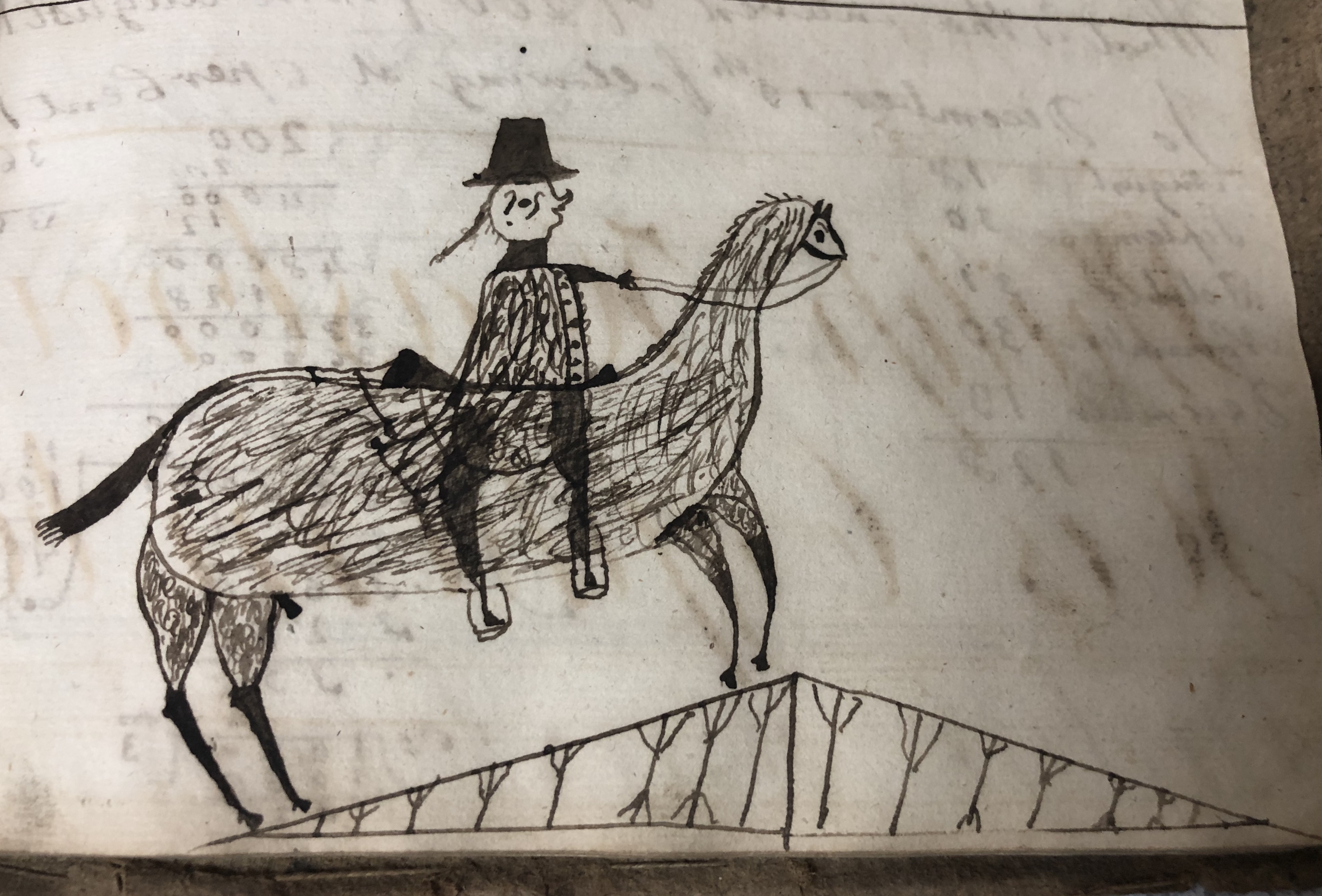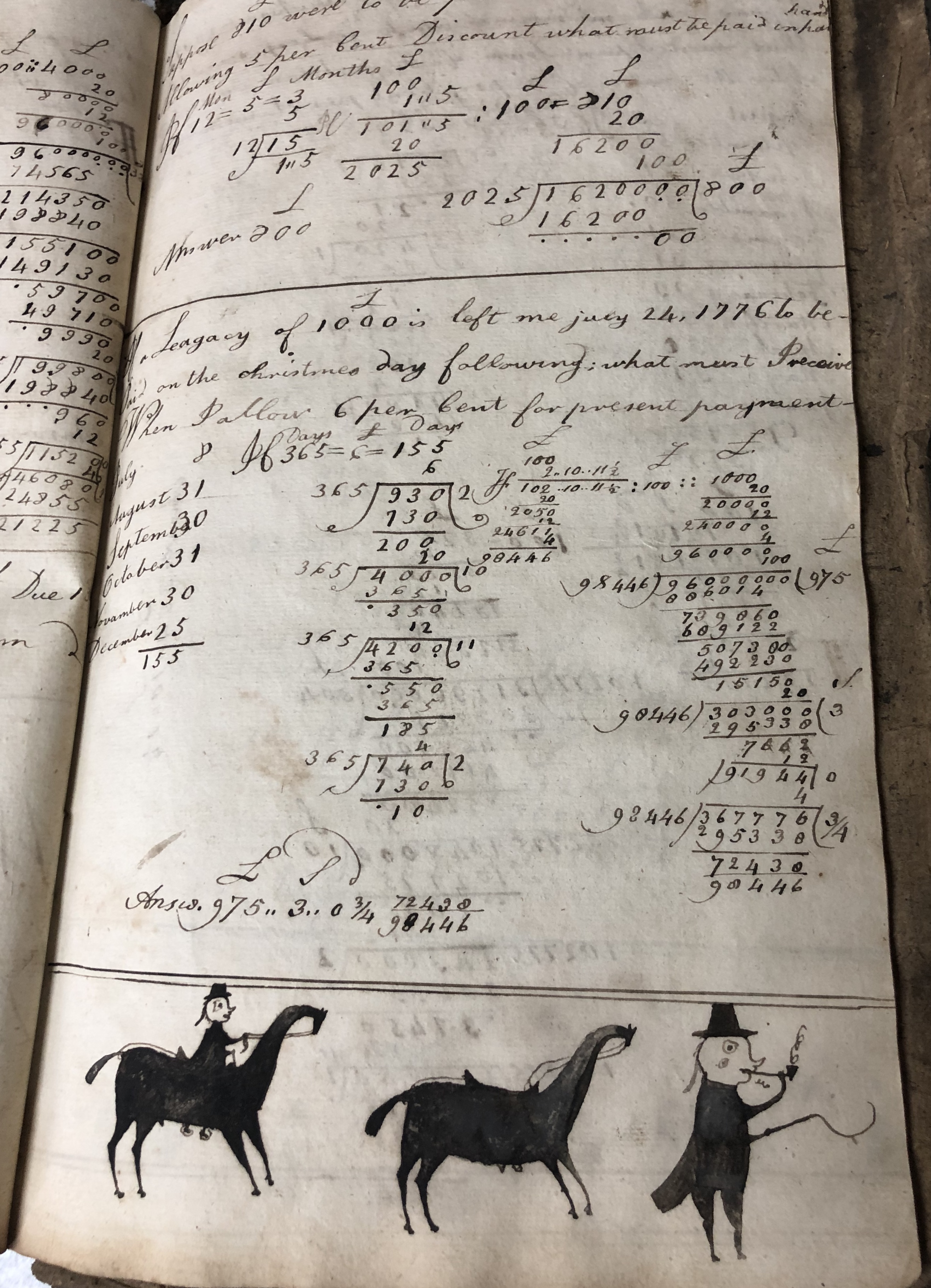 Although clearly a diligent student, the abundant doodles throughout the book are a testament to Philip’s occasionally wandering mind. For me, looking through this book was such a strange experience; its characteristics and content seemed so foreign to my conception of what education is like, and his doodles seemed to lend a bit more humanity and authenticity to the artifact. Seeing his small pictures that appeared more frequently the further I delved into the ciphering book, I was able to more fully reconcile with the fact that a child held this book in his hands, once, and wrote in it, did his math problems, likely became frustrated or tired at times, and turned to drawing in fits of boredom. It seemed that Philip’s favorite things to draw were horses and men, and they have various (sometimes silly) appearances. Some of the men smoke pipes or are holding whips in front of horses, and they are often well-dressed, with long hair and wearing tall hats. I wondered if his doodles spoke to his perception of the men around him, of their activities, and perhaps what it meant to “be a man” in his community in this time period.