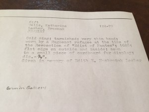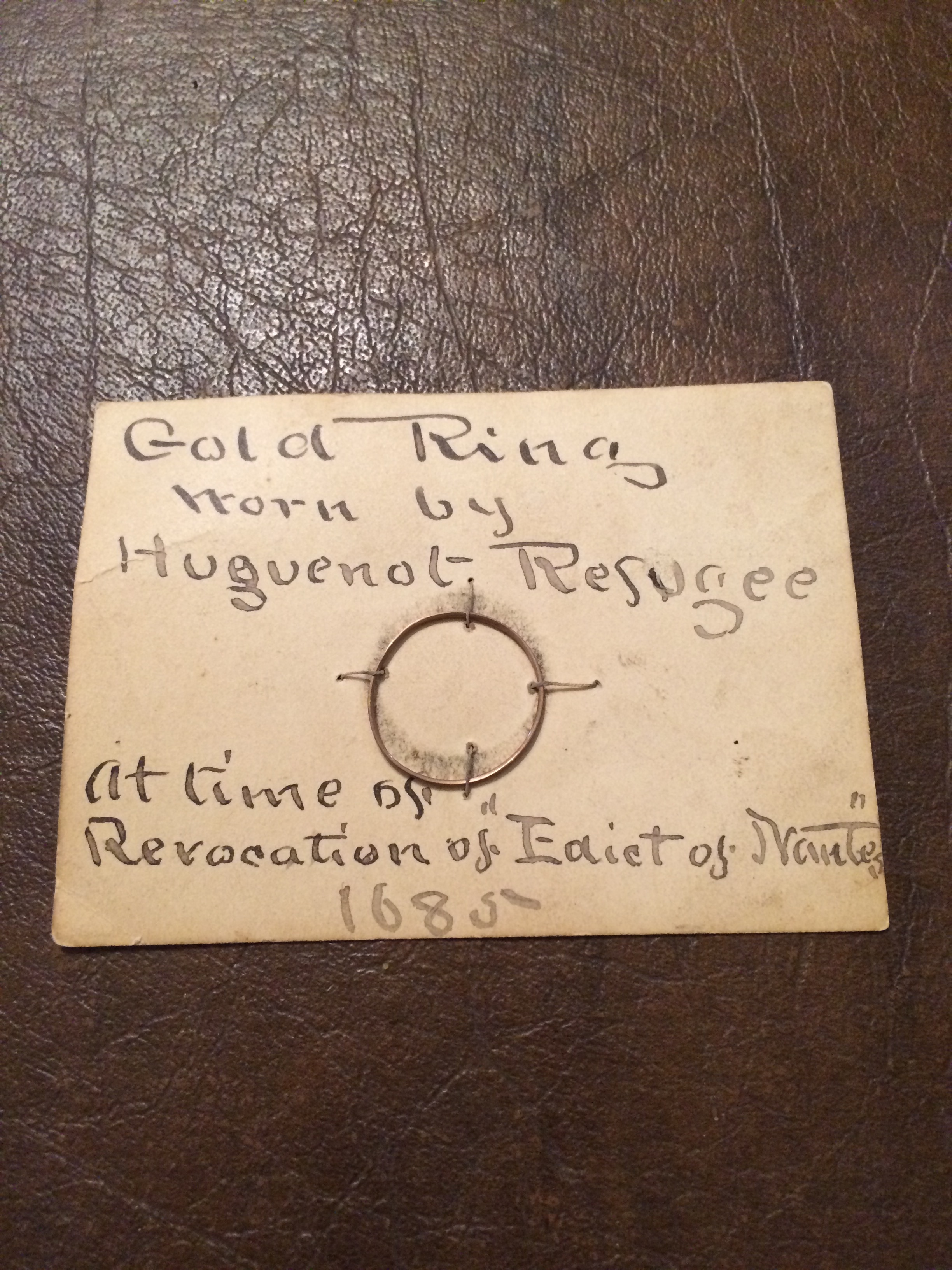 The object combines fascination and frustration—it could potentially be an object of great importance for it could be a material link to the very event that caused the great emigration of Huguenots to various places around the world, in this particular case, our home of New Paltz. However, it could unfortunately be of no consequence at all—a story of make believe thought up by perhaps a history fanatic with a grand imagination or a distant relative related to someone in the New Paltz genealogy that could have sworn that’s how the story went about the ring in the retelling of a tale.