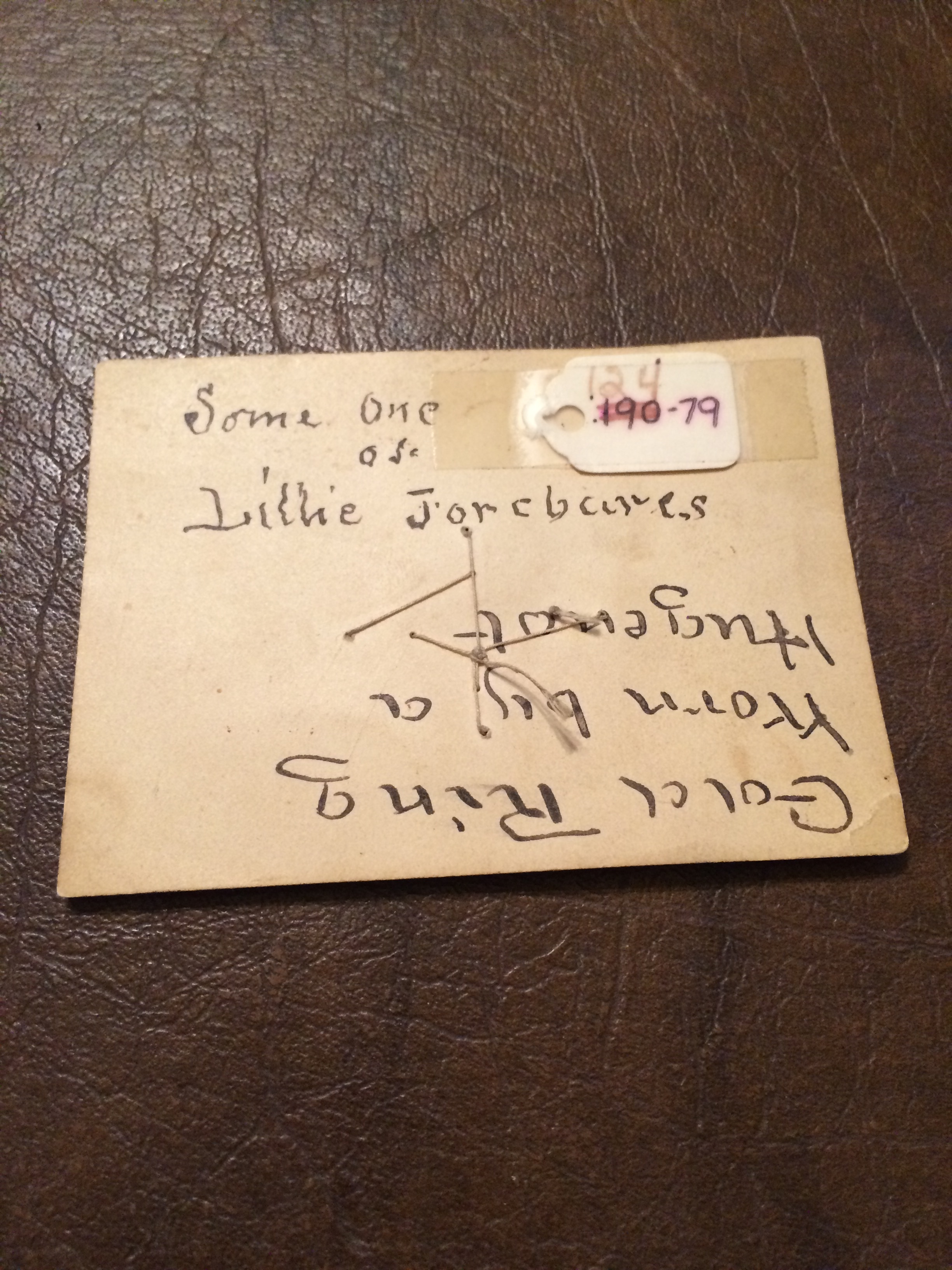 Physical Description: The ring is fastened to a piece of somewhat thick paper, thicker than typical writing paper of today. It is fastened to the middle of the paper by four pieces of string, punctured through the paper and tied together on the backside. The ring has left a grey circle on the paper where perhaps the material of the ring has rubbed off onto the paper like tarnish from years of being attached. Information has been written onto the paper on which the ring is secured that suggests a great history for such an unassuming object. “Gold Ring worn by Huguenot Refugee // at time of Revocation of “Edict of Nantes” 1685” is written in ink onto the front of the paper above and below the placement of the ring. The script certainly looks like it was written from a different time where words were written on paper by quill and ink with a more expressive style. The back of the paper possibly reads: “Some one of Lillie Forebares” though the handwriting is somewhat illegible as compared to the other writing on the paper. Additionally, written upside-down and opposite the aforementioned description is a repeat of the front detail, this time stating: “Gold Ring worn by a Huguenot”.