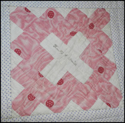 The appearance of this quilt varies greatly from the previous stated one, despite its simple repetitive pattern. This quilt includes brights colors such as reds and oranges, rather than predominantly using blue fabric. However, the significance of this object lies in the signatures that are present within the quilt. In the middle of each diamond-shaped design, as shown in the images, is a signature of who is presumed to be one family member.