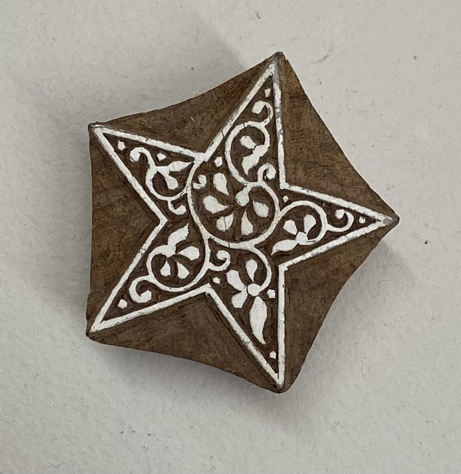 Some of the wallpaper has peeled off, but a large strip remains in the central area of the wooden plank, as well as a thin piece at the top edge and fragments on the bottom and middle. Browning from possible water damage has removed some of the color on the right side of the wallpapered board. Next to the browning there are areas of a cream paper, which seems to have been layered on top of the orange wallpaper, possibly as a border or as a later addition. Looking closely at this paper, there is a subtle glimpse of a minimalistic vine pattern. On the areas of the orange wallpaper that surround this cream paper, there are lines of white where the orange color may have been stripped when the cream paper was removed.