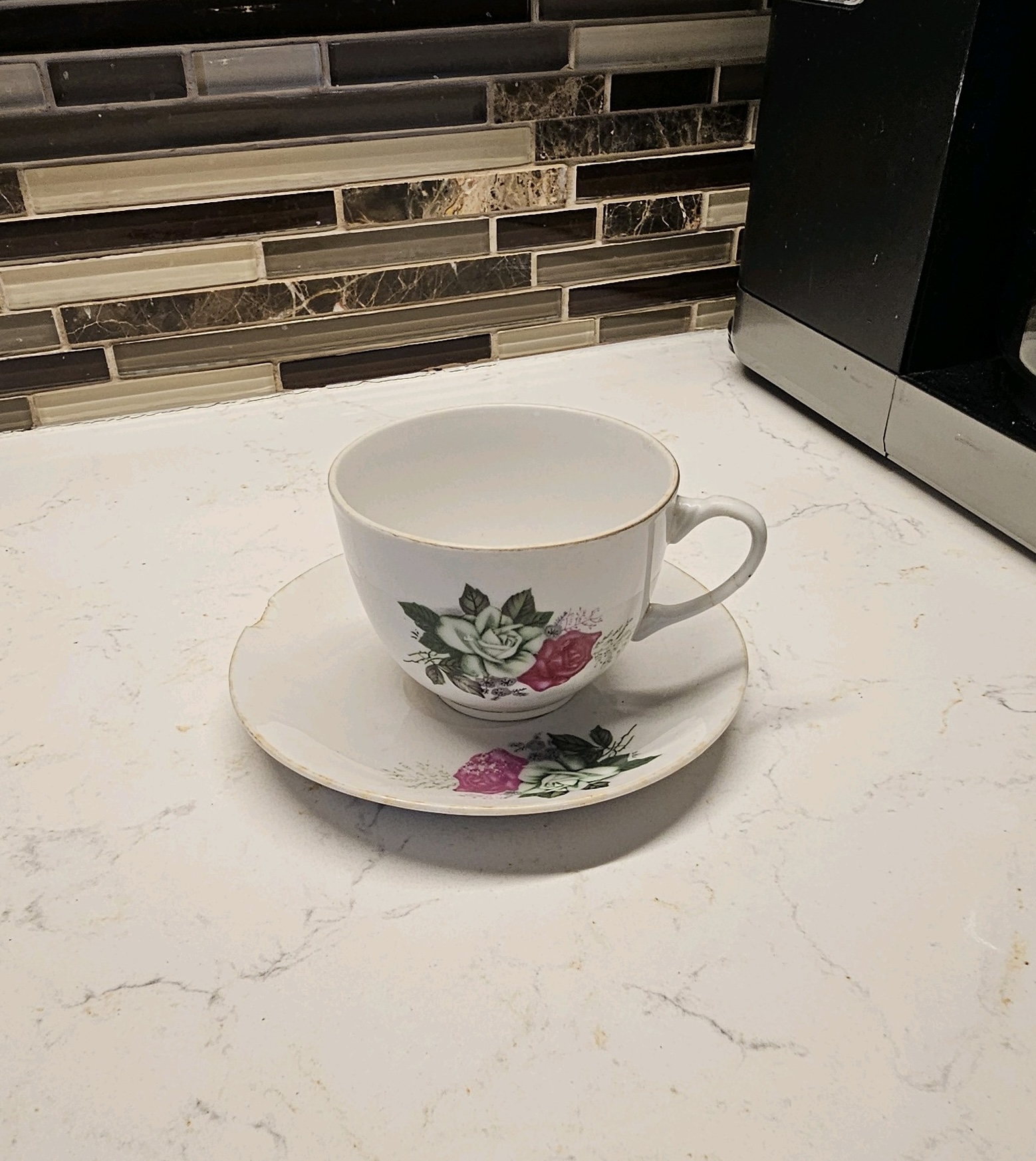 The comforting aroma of fresh coffee fills the morning air as my mom brews my grandmother her daily cup of coffee. As long as I can remember, my grandmother, Lola, would start her day with a hot cup of coffee in her signature cup. The cup is made of delicate white porcelain with a faded gold edge from years of use. Measuring two and a half inches tall and three inches wide, the size proved perfect; even in her final years, the cup fits perfectly in her frail hands. Even as Lola began to forget who she was and what was important, her cup of coffee in the morning remained consistent and something she always remembered. The saucer the cup lays on is 5 inches long, sharing the same delicate white porcelain and faded gold edge, with a slight chip on the edge from decades of love and use. The cup and plate both feature green and magenta roses, adding a floral accent found on many of Lola’s belongings.