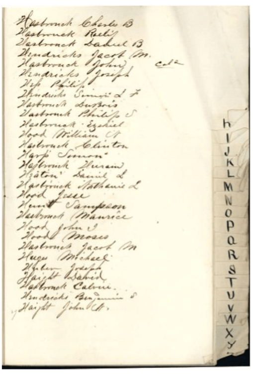 Physical Description: The page that lists John Hasbrouck is contained within a booklet still in good condition. The page is estimated to be 8.5” by 11”. The booklet is kept within a manilla folder which is the legal size of 9.5” by 14.6”. The manilla folder is kept inside a file box. The booklet does have some creasing, specifically where the tab that indicates the page of the voters’ last name beginning with that letter has been dog-eared. Additionally, the ink of each page within this booklet can be seen to have bled onto the page before it. All names appear in cursive.