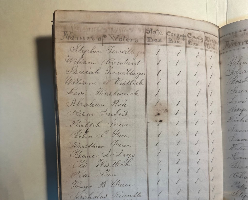 Caption: The above image is a list of registered voters in New Paltz from 1859, whose last name begins with letter H. John Hasbrouck is labeled as color on the right-hand side. Once thought to be the first Black man to vote in New Paltz, now John Hasbrouck has been stripped from that title.